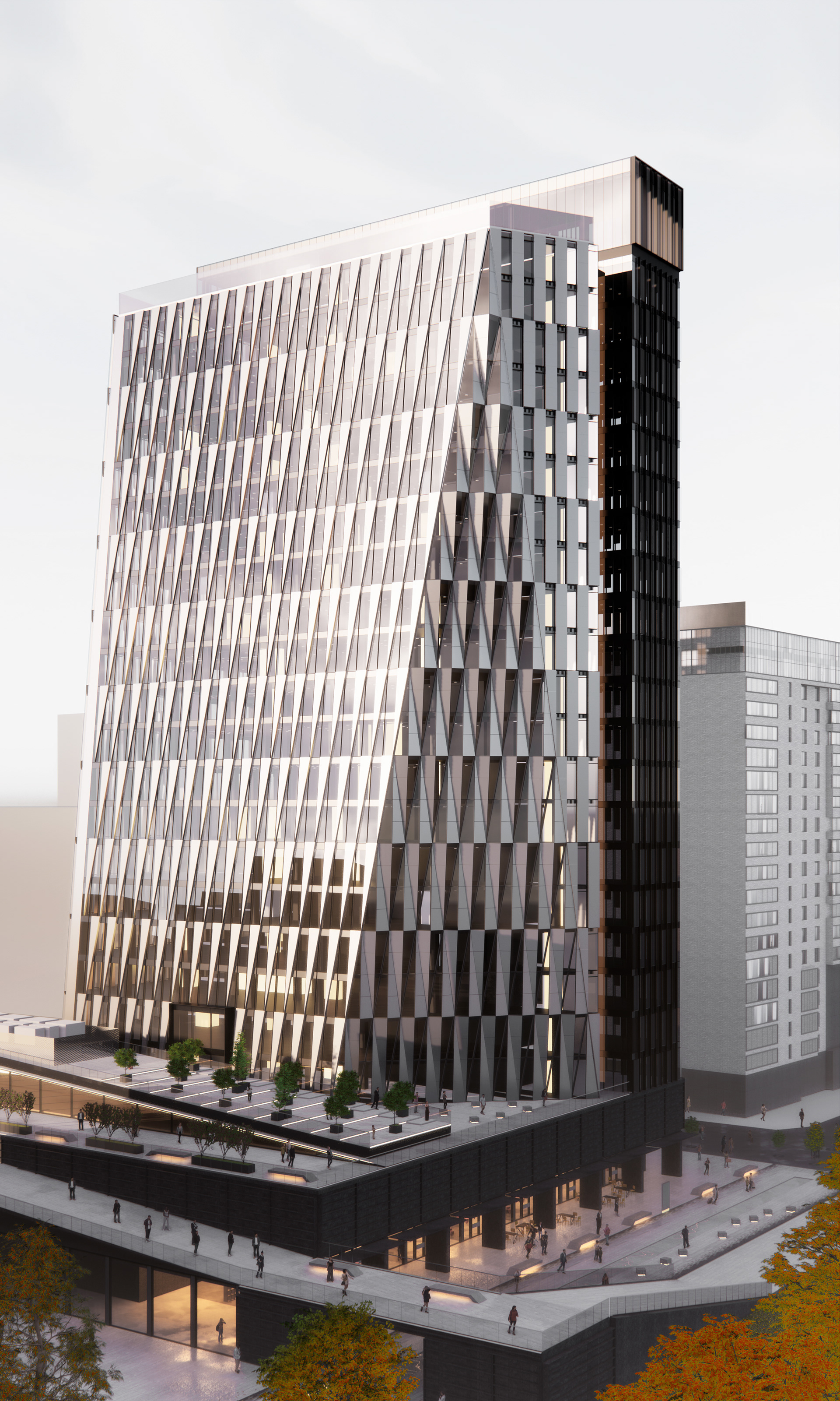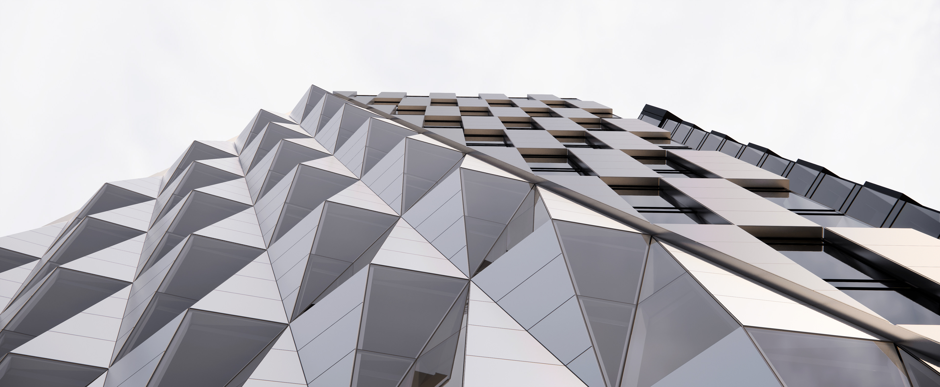 Общий объем башни делится на две части: высокий – строгий и минималистичный – «одет» в металлические ламели, низкий – «кристалл» с акцентной треугольной сеткой.